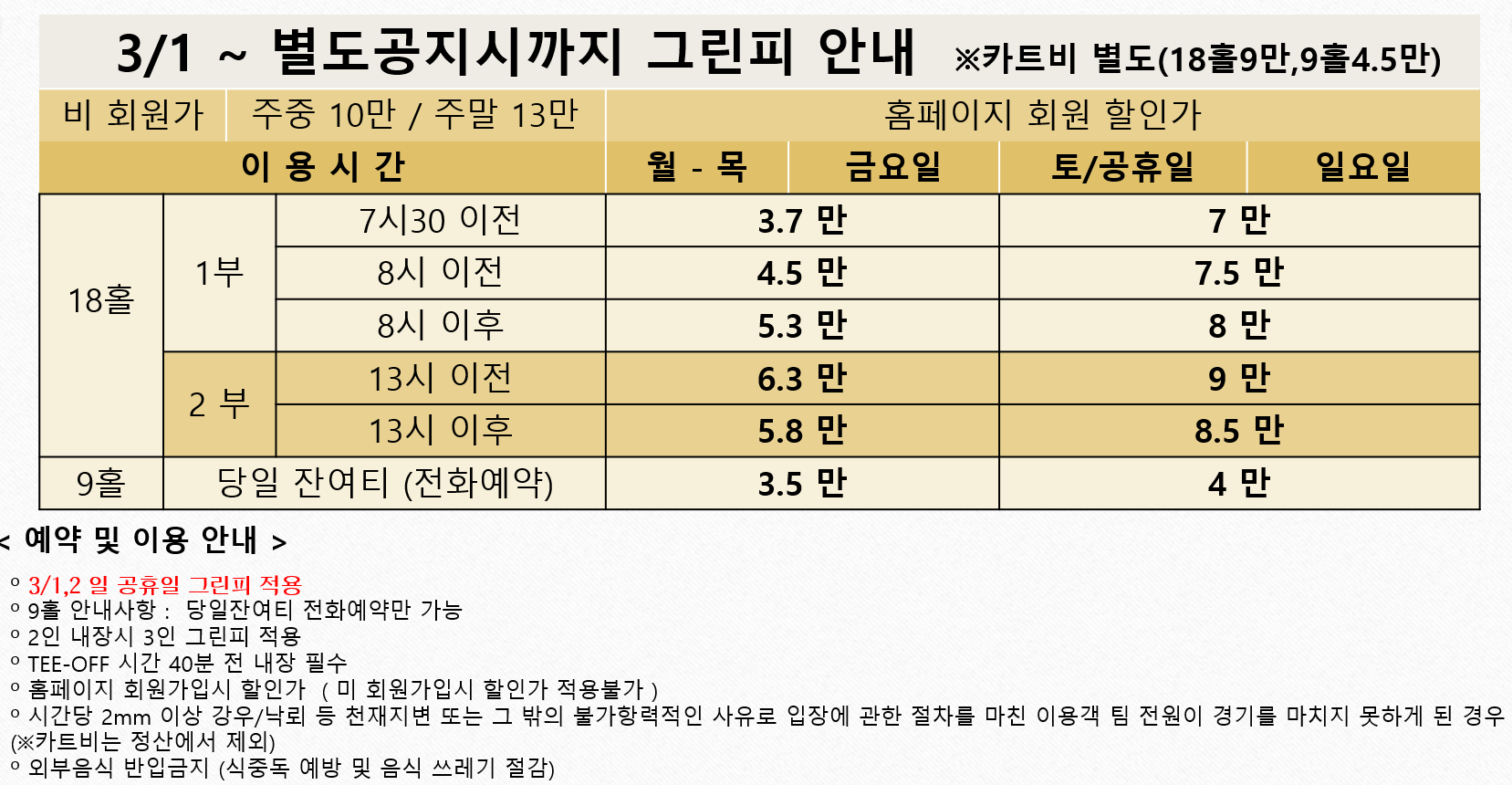 2026년 3/1~별도공지시 까지 그린피 안내 입니다. º 3/1,2 일 공휴일 그린피 적용 º 9홀 안내사항 : 당일잔여티 전화예약만 가능 º 2인 내장시 3인 그린피 적용 º TEE-OFF 시간 40분 전 내장 필수 º 홈페이지 회원가입시 할인가 ( 미 회원가입시 할인가 적용불가 ) º 시간당 2mm 이상 강우/낙뢰 등 천재지변 또는 그 밖의 불가항력적인 사유로 입장에 관한 절차를 마친 이용객 팀 전원이 경기를 마치지 못하게 된 경우 (※카트비는 정산에서 제외) º 외부음식 반입금지 (식중독 예방 및 음식 쓰레기 절감) |